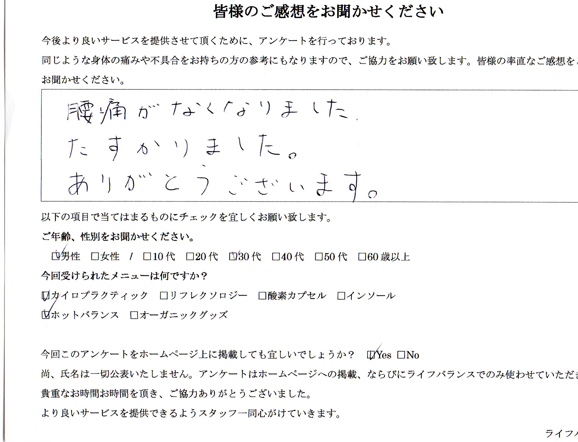 HOME > お客様のお声 > 施術後の腰痛の改善 2025年8月14日 ご予約はこちらからお願いいたします。 この記事を書いた人 最新記事 ライフバランス ホームページへのご訪問ありがとうございます。千葉県松戸市の国際基準のカイロプラクティック・整体のライフバランスでございます。 〒271-0092 千葉県松戸市松戸1836目黒ビル2階、 ☎︎047-361-1233 2025/08/19リフレクソロジー テスト 2025/08/12悩みが前向きになれた 2025/08/12肩こりとたまに起きる頭痛が辛い ライフバランスの記事をもっと見る -お客様のお声